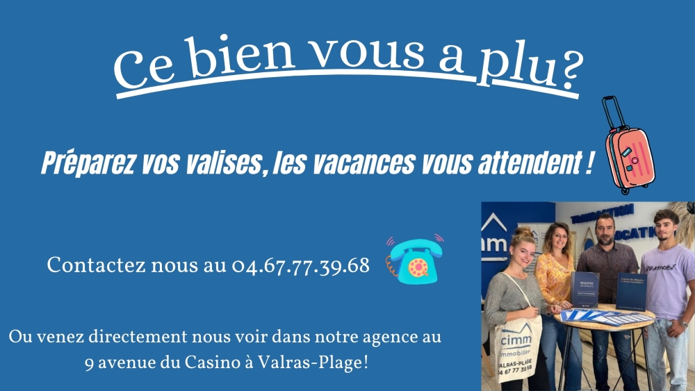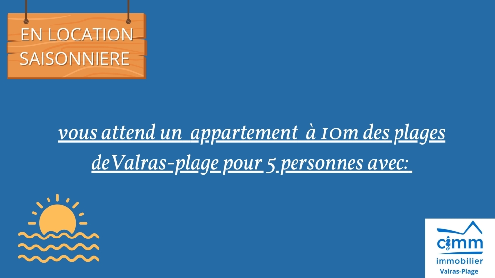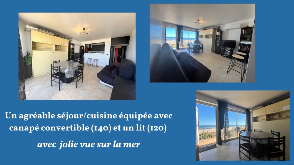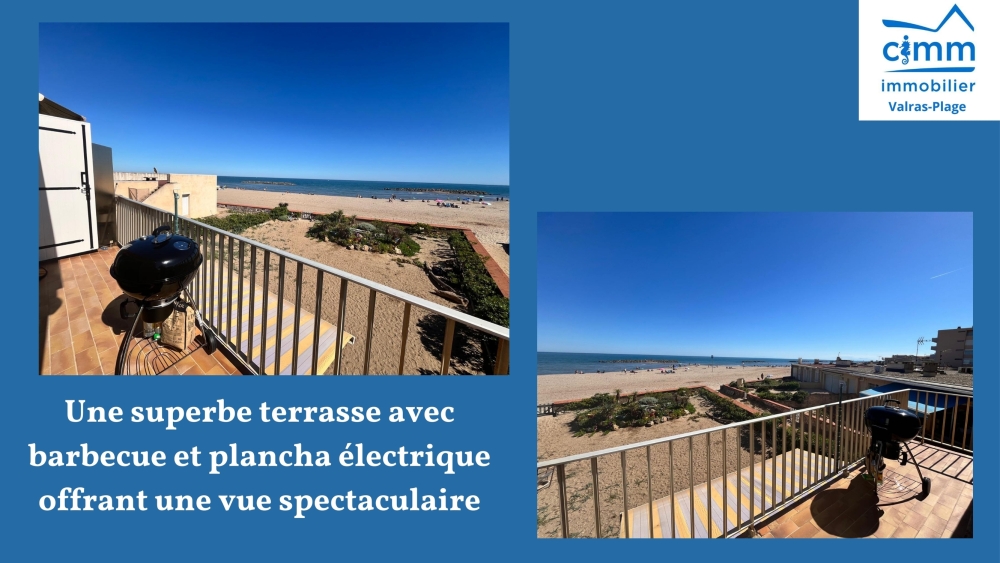 Votre [agence Cimm Immobilier] à [Valras-Plage] vous présente les photos de cet appartement rénové en bord de plage. Pouvant accueillir jusqu'à 5 personnes, vous pourrez profiter de la belle vue mer que laissent entrer les baies vitrées du séjour cuisine, du barbecue sur la terrasse, d'une place de parking privative, de la climatisation lors des fortes chaleurs, et d'autres équipements qui vous permettront de passer un séjour formidable !